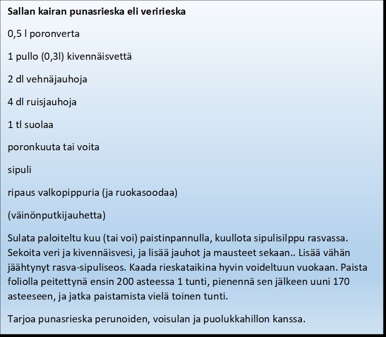 Pakastetusta poronverestä voit valmistaa itse veriohukaisia, kampsuja tai punasrieskaa.
